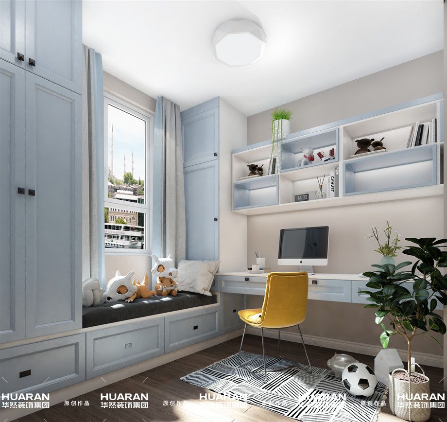 书房采用浅蓝色调。作为业主休闲和工作的区域,除了满足业主的工作需求,更要迎合年轻人的兴趣爱好。设置了部分储物空间作为收藏区,摆放业主喜爱的装饰品和书籍便于拿取。